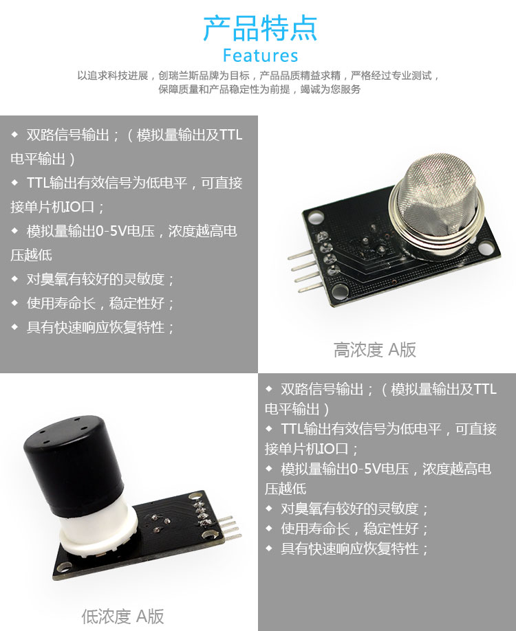 这款臭氧气体检测传感器模块具有以下特点1,具有信号输出指示灯;2,双路信号输出(模拟量输出及TTL电闰输出);3,TTL输出有效信号为低电平(输出低电闰时信号灯亮,可接电片机IO口);4,模拟量输出随浓度增加而降低,浓度越高电压越低;5,对臭氧气体具有很高的灵敏度;6具有长期的使用寿命和可靠的稳定性;7,快速的响应恢复特性;8,带安装孔,方便固定安装;9,探头可插拔设计,方便试验。广泛应用于家庭和大气环境中的臭氧气体探测装置。提供参考例程、电路图和探头说明书。