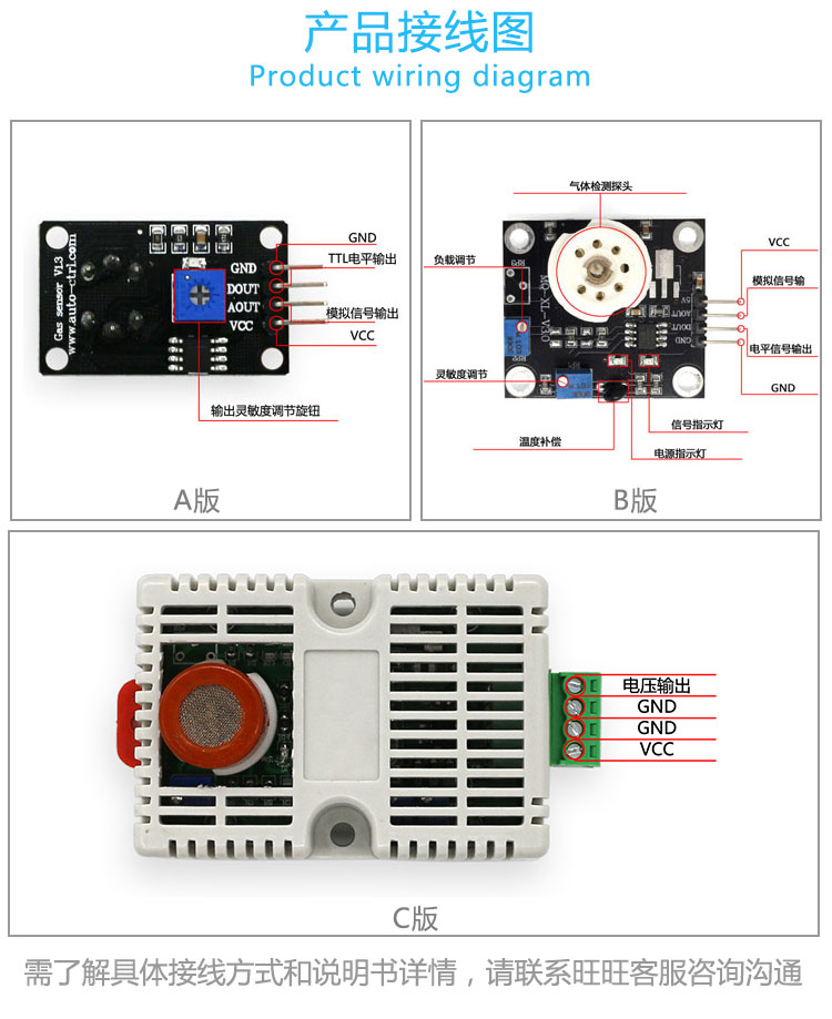 4、模拟量输出Vair~4.8V电压,浓度越高电压越高;