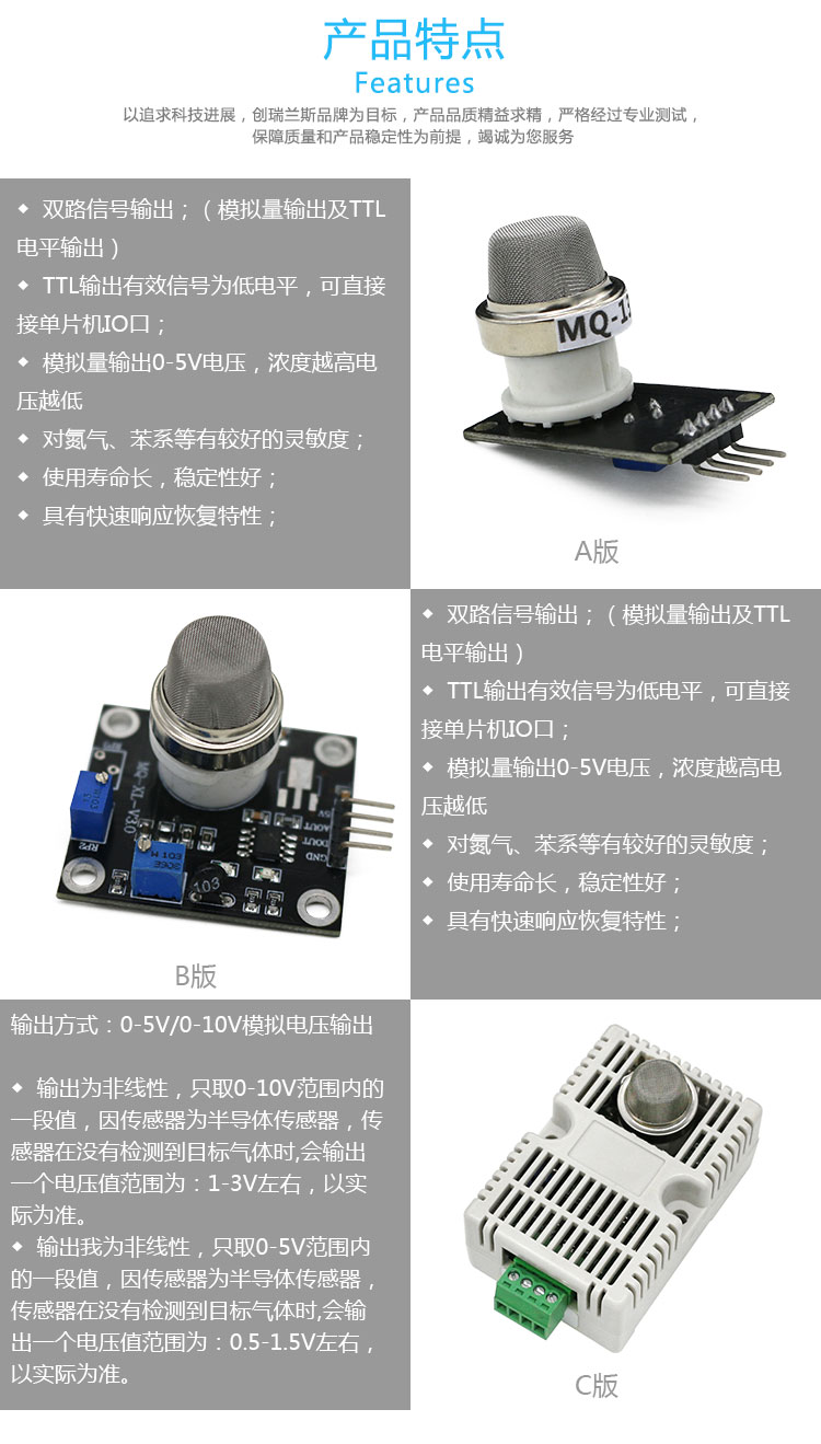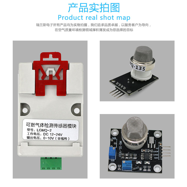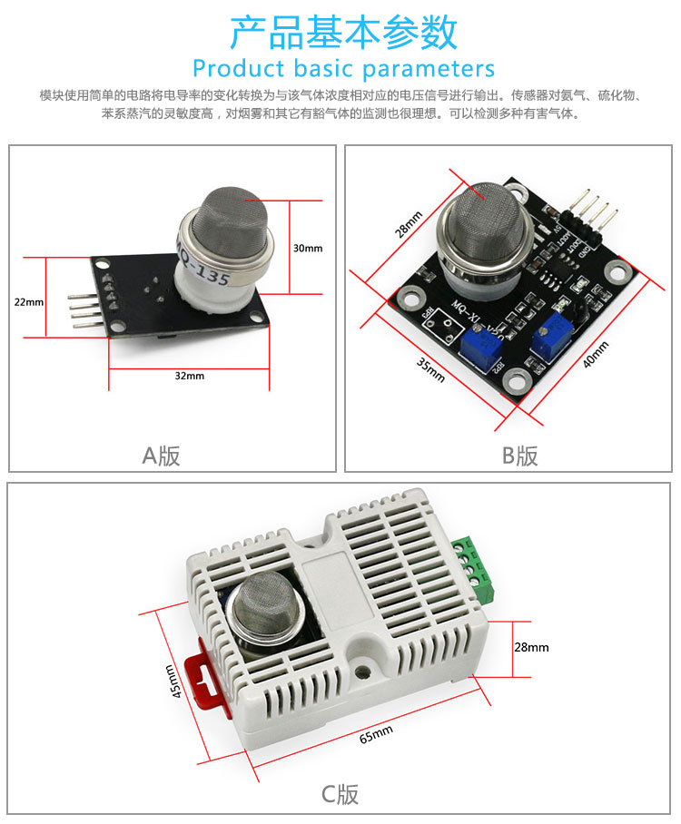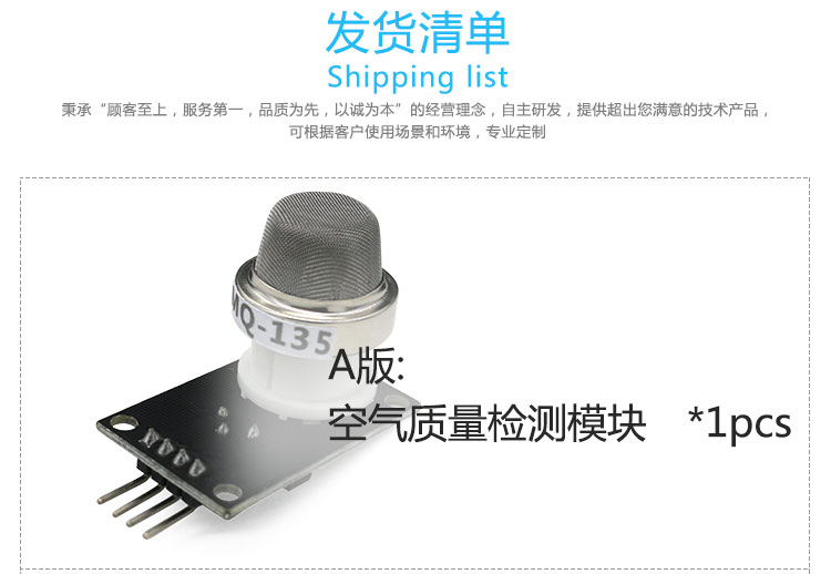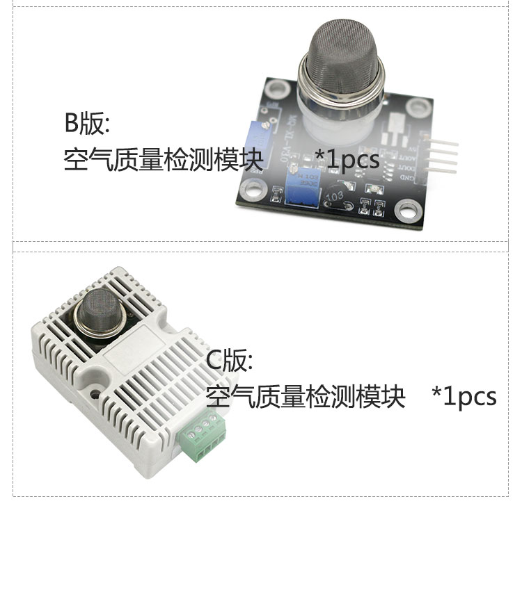 空气质量检测传感器模块 氨气甲苯氢气空污物联网MQ135气体传感器,对液化气、丁烷、甲烷、烟雾等有较好的灵敏度;模拟量输出对应电压变化,浓度越高电压越高;输出信号范围可以调节;带模拟信号输出;使用寿命长、稳定性好;具有快速响应和快速恢复的特性。 空气质量检测传感器模块适用于家庭、工厂、地下车间、矿井等气体易泄漏场的实时监测,适宜于烟雾、液化气、丁烷、甲烷等气体监测装置。